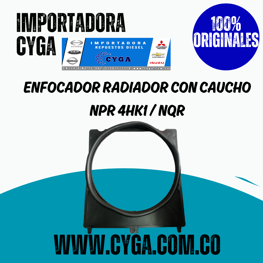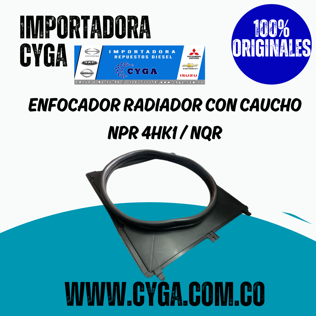 Enfocador de radiador con caucho, compatible con Isuzu NPR y NQR con motor 4HK1T. Diseñado para mejorar el flujo de aire hacia el radiador, optimizando la refrigeración del motor. Producto nuevo, importado y disponible para entrega inmediata.